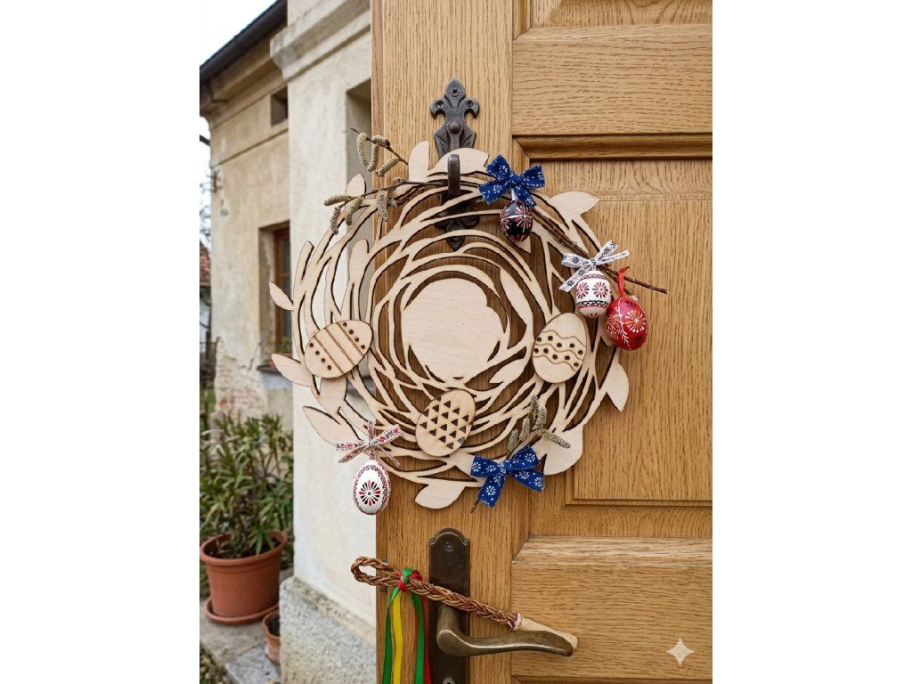 Ozdobte své dveře nebo stěnu tímto originálním věncem, který kombinuje přírodní styl s hravými detaily. Precizně vyřezávaný motiv propletených větviček a zdobených kraslic okamžitě navodí tu pravou velikonoční atmosféru.