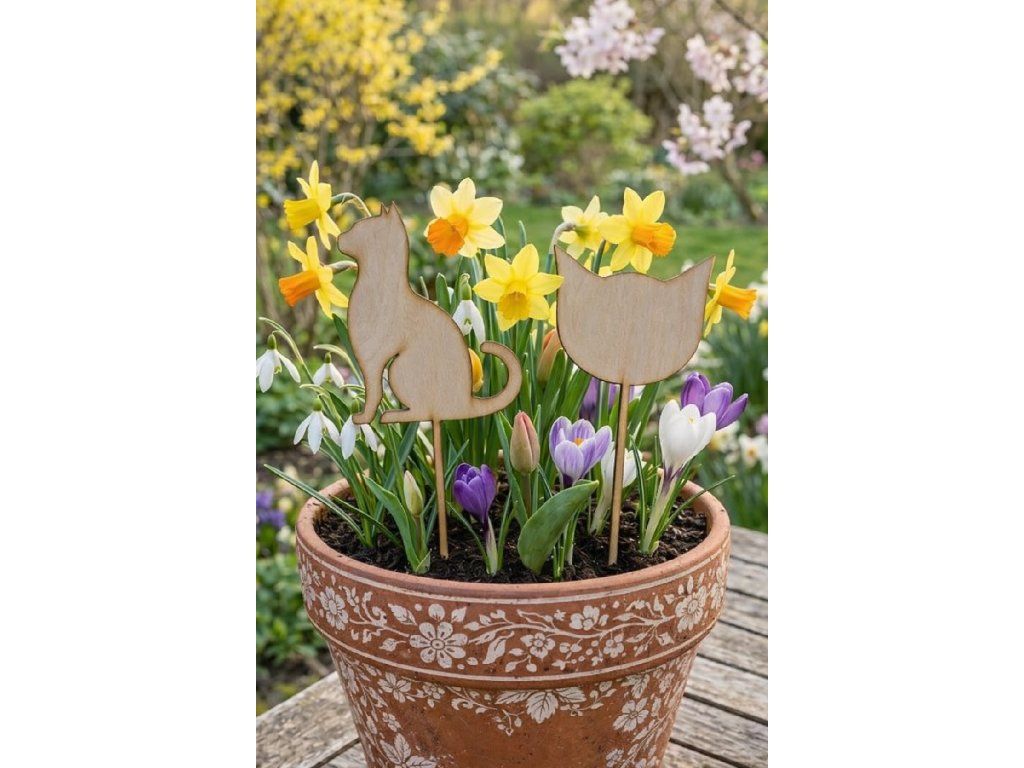Dodejte svým květinám originální a přírodní vzhled díky dřevěnému dekoračnímu zápichu ve tvaru kočky. Tento stylový doplněk krásně ozdobí květináče, truhlíky, zahradní dekorace i jarní aranžmá. Minimalistický design z přírodní březové překližky se hodí do každého interiéru i zahrady.